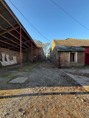 - Traditional farmyard with red sandstone buildings