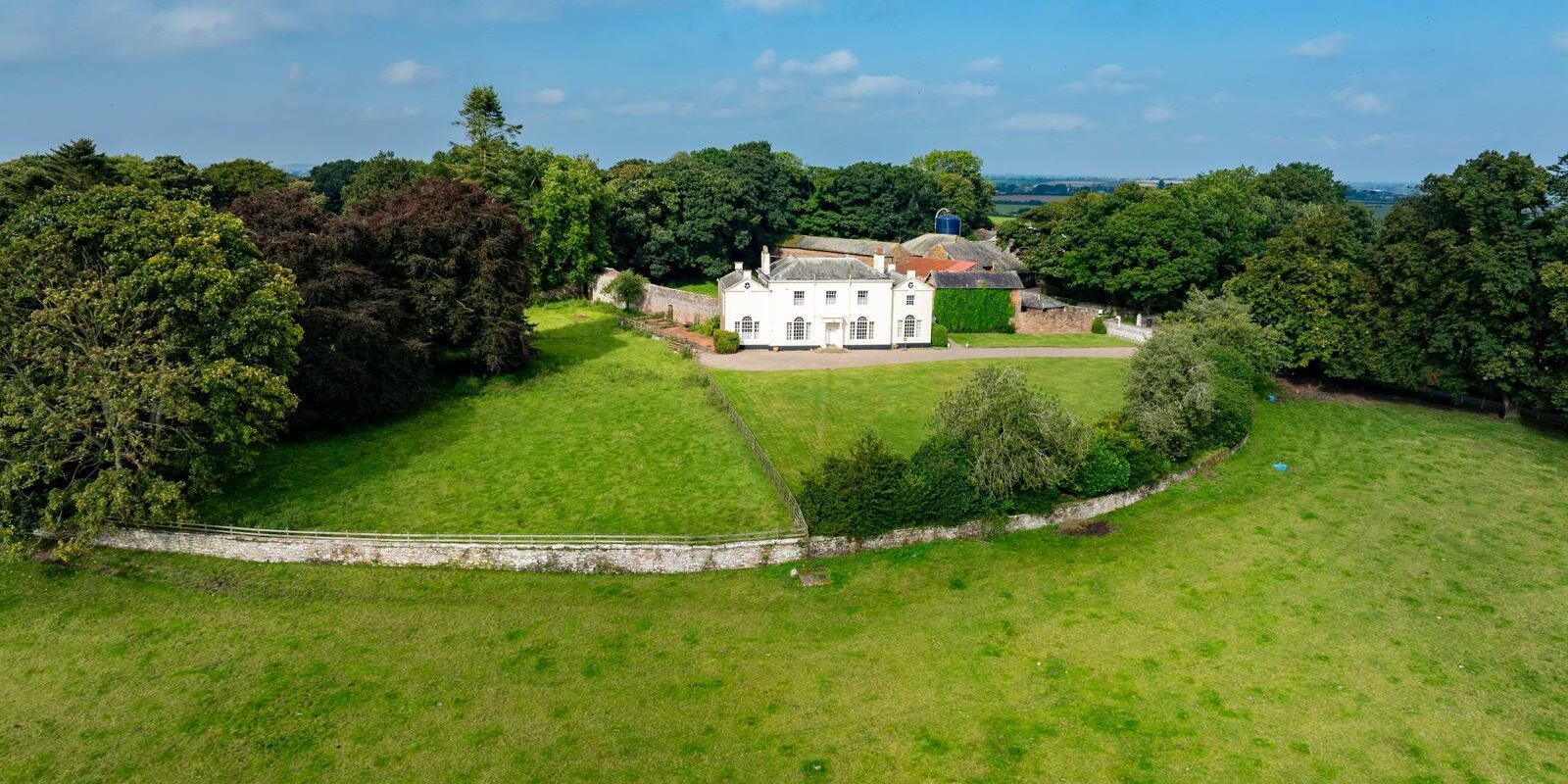 Featheridge Farm’s key feature is a substantial, empty Grade II listed farmhouse built in 1824, set deep within 310 acres of working farmland in Cumbria. Approached via a private half-mile tarmac driveway, the house feels grand and isolated, sitting elevated within the landscape and surrounded by open fields and rolling countryside. The position offers long, uninterrupted views: across farmland towards the Lake District to the front, and over the Solway to Scotland.