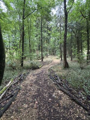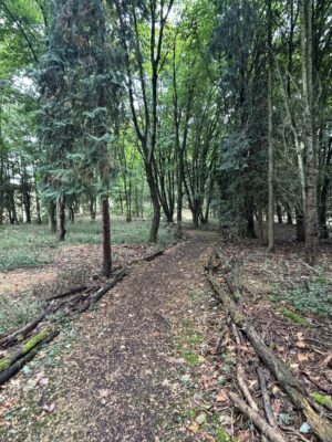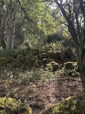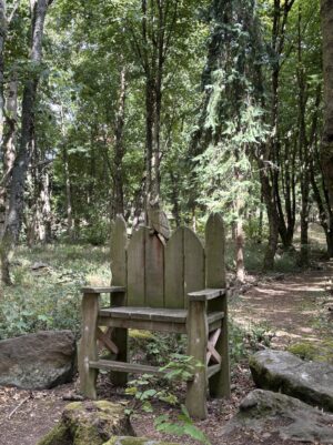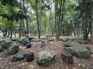 - Woodland areas with natural clearings, a campsite, moss-covered rocks and a carved throne