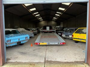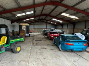 Classic and modern vehicles on-site, including Porsches, Mustangs, Land Rovers, and tractors