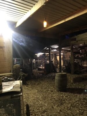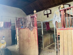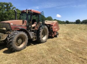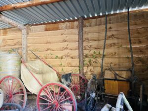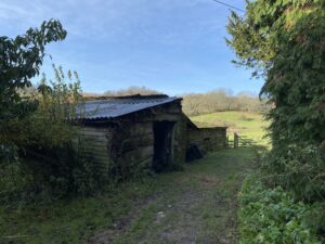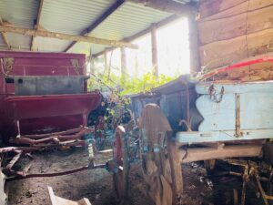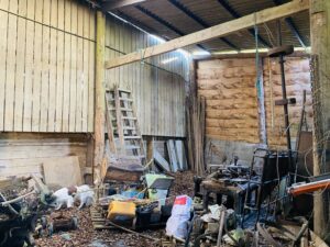 Traditional farmyard with timber pole barns, stables, old machinery and hardstanding
