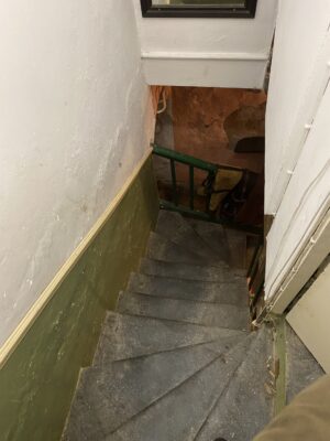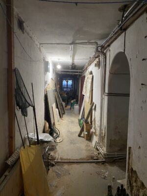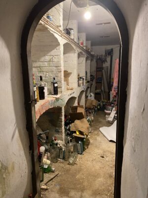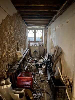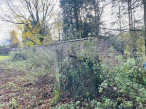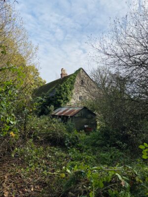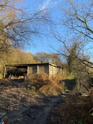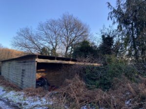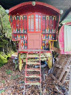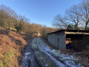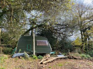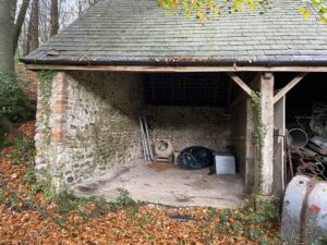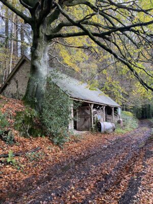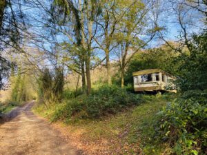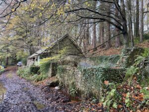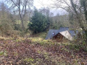 Derelict stone linney, other buildings and static caravan in the woods